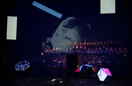 В конце по занавесу летает и лучится проекция улыбающейся девушки в венке — образ Вечной женственности.