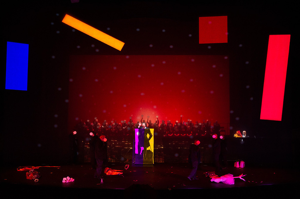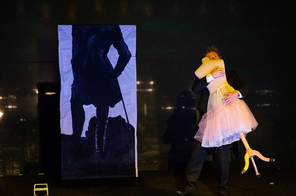 Тёмные фигуры с зелёными головами медленно и многозначительно выносят на сцену и позже уносят разные предметы: серый макет собора, розовую вешалку в юбке, юлу, картонных гномов на качелях, синюю виолончель, окровавленную скомканную простынку (потом её повезли на тачке хоронить), конечно, деревянный крест и лопату.