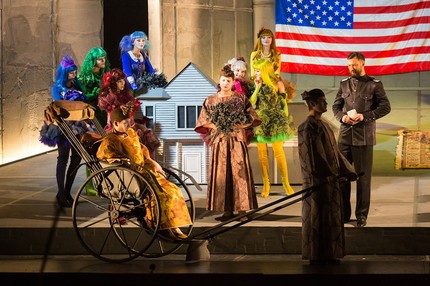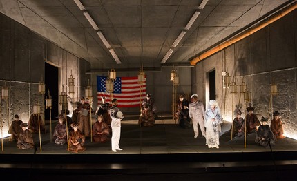 Японская бабочка Чио-Чио-сан после отъезда бросившего его Пинкертона деградирует в американский «кокон» (его напоминает белый спортивный костюм и белый короткий парик главной героини). Превращаясь с финальным харакири в прах, «кокон» навечно остается в возведенной на сцене серой бетонной коробке, как в траурной урне. В этой инсталляции Пинкертон, конечно же, не обеляется и не идеализируется, но и трагедия Чио-Чио-сан (Мадам Баттерфляй) никакого сочувствия не вызывает: какая разница – одной бабочкой меньше, одной больше… А сачок, поймавший и сгубивший ее, похоже, был сшит именно из американского флага, который водружается в бетонной коробке Чио-Чио-сан Пинкертоном. Гигантская копия этого флага служит и занавесом-водоразделом спектакля, идущего в двух актах. Но как же всё это банально и абсолютно бессодержательно!