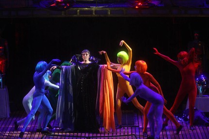 Маркируем наиболее показательные акценты в дальнейшем развитии режиссерской концепции об актуализации истории о Саломее в наши дни, о «тяжелом моральном цейтноте в современной европейской цивилизации», о «приоритете морали над телесным» (из интервью с режиссером М. Панджавидзе). Так, в симфоническом эпизоде (завершает 1 акт спектакля) после третьего вожделения и последующего проклятия Саломеей Пророка, на сцене появляются семь танцовщиц в платьях цветов радуги (оригинальная идея расщепления белого цвета чистоты и невинности на все цвета спектра). Это семь пороков-грехов, которые терзают-искушают Саломею. Заметим, что в основных костюмах Саломеи также прослеживается перемена ее психо-физиологических состояний: бело-черный с кокетливой береткой в первых сценах, роскошно черный по-змеиному блестящий после танца семи покрывал и финальная катарсическая белизна. Греховные соблазны, чревоугодие, прелюбодеяние, лень вырываются из сущности Саломеи и начинают жить самостоятельной жизнью, несмотря на ее первоначальные попытки уберечь себя от раздирающих страстей.