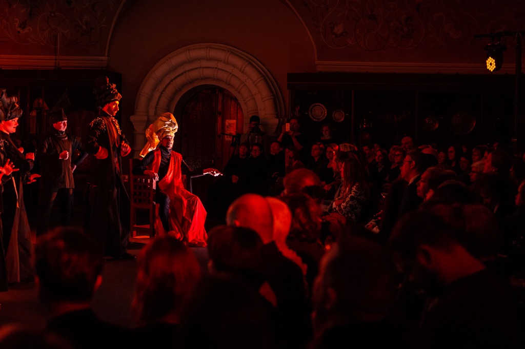 Творческий союз артистов из Санкт-Петербурга — ансамбль «Солисты Екатерины Великой» и «Барочный балет Анджолини», представили публике, пришедшей в этот вечер в Мироваренную палату Патриаршего Дворца, свой взгляд на историю театра. Неутомимые исследователи культуры XVII–XVIII веков, мастера реконструкции, в арсенале которых постановки комической оперы Екатерины II «Горебогатырь Косометович» и первой оперы на русском языке «Цефал и Прокрис» Франческо Арайи, в этот вечер играли драму основателя «школьного театра» в России Симеона Полоцкого. Придворный поэт и наставник детей царя Алексея Михайловича Романова, Симеон Полоцкий сочинил пьесу в стихах под названием «Комедия о Навуходоносоре-царе, о теле злате и о триех отроцех, в пещи не сожженных» специально для придворного театра. В спектакле были использованы фрагменты церковного чина «Пещного действа», совершавшегося в XVI–XVII веках перед праздником Рождества Христова в Успенском соборе Московского Кремля.