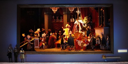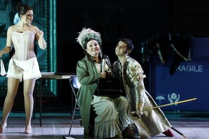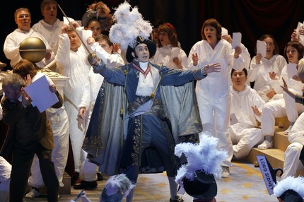 Это важное замечание, не затрагивая музыкально-стилистический аспект, невольно дает постановочные козыри тем режиссерам, которые зачастую идут не от сюжета и не от музыки, а от своих внутренних комплексов, искусственно пытаясь показать на сцене лишь им самим понятные внешние проявления. Таков и невероятно модный сегодня итальянский режиссер Дамиано Микьелетто. То в своих болезненных фантазиях он просто неадекватен, напрочь выплескивая оперу, что с водой ребенка, то бывает довольно «резов, но мил» и даже, как в обсуждаемом «Путешествии в Реймс», иронично легким, изобретательным…