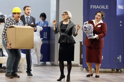 «Камерное», «легкомузыкальное», но вовсе не опереточное, а утонченно-изысканное по своей музыкальной сути академическое действо под названием «Путешествие в Реймс» на сей раз обжило Историческую сцену Большого, и отчасти на ней «утонуло»: сдвинутые кулисы и опущенный верх обозначили «микроскопичность» сценографии по отношению к габаритам огромной сцены совершенно очевидно. А вот в пространство Новой сцены она вписалась бы просто идеально, да и музыкальное наполнение получила бы куда более рельефное! Но имеем то, что имеем, и на сей раз это арендная, а не собственная постановка (совместно с Нидерландской национальной оперой, Королевской Датской оперой и Оперой Австралии). Постановка эта – довольно старая, так что повидать виды успела. Ее премьера в Амстердаме состоялась в январе 2015 года, и вот теперь доехала до Москвы!