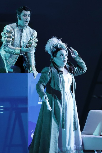 Можно сказать, не побоявшись упреков в крайности, что перед нами – «опера ни о чем». Но ее роскошная музыка создана ради самóй музыки, ради того, чтобы, закрыв глаза на неуклюжесть либретто, обратиться в слух и просто внимать дивной партитуре, огромное место в которой отведено виртуозному вокальному музицированию (не только сольному, но и ансамблевому). И хотя в армии певцов-солистов из двух подготовленных составов-взводов не все воины отличились доблестью (об этом – позже), общий вокальный позитив очевиден. Новая работа Большого театра – более оптимистична и светла, чем «Севильский цирюльник», премьера которого 3 ноября на Новой сцене вызвала шок, прежде всего, вокальной рутиной в партиях Розины и Альмавивы.