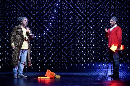 Зороастро (Александр Рославец) в страшном евнуховидном костюме и Королеву ночи выделили из всех тем, что они пели из оркестровой ямы, тогда как их световые увеличенные изображения проецировались на световые гирлянды. От Джессики Пратт в партии Королевы ночи после прочтения её послужного списка невольно ожидала большего, но её тембр голоса, будто исцарапанный, придал ариям оригинальный оттенок.