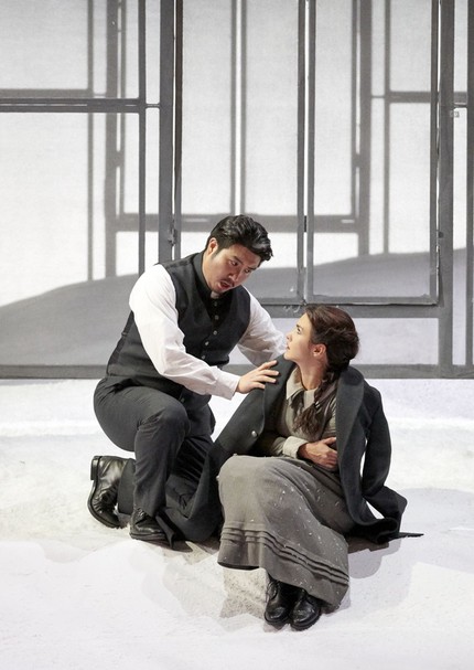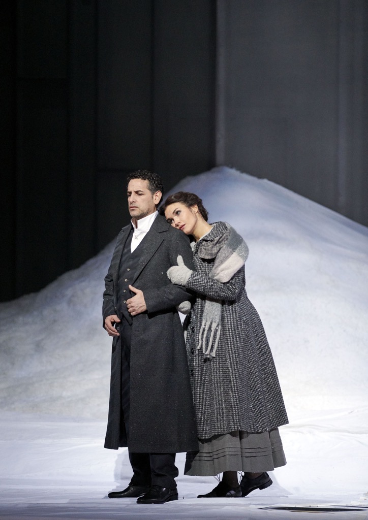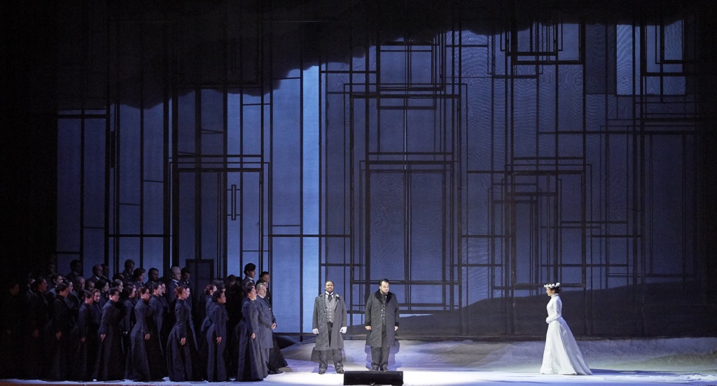 Начну с увиденного. Режиссёр Лоран Пелли — мастер, который своей сценической интерпретацией «Дочери полка» Доницетти (2007), на мой взгляд, поставил себя выше всякой критики: спектакль, возобновлённый на сцене Венской оперы в 2017-м году, до сих пор остаётся одним из ярчайших образцов виртуозной работы с белькантовым материалом. В этой связи говорить что-то о режиссуре (и оформлении, выполненном Шанталь Тома) новой «Лючии» очень тяжело: декораций практически нет, на сцене — «тёмная ночь» и «белый снег». Прозрачные вертикальные контуры «чего-то там» вызывают смешанное чувство неловкости (то ли сэкономили, то ли недоделали), а костюмы, как обычно, из ниоткуда (хоть и сидят, правда, хорошо).