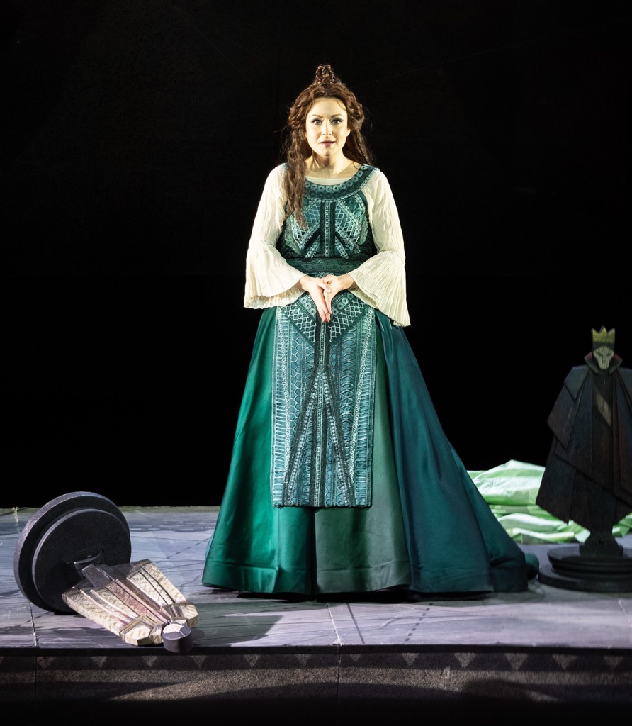 Современная абстракция как идея воплощения мифа, вневременное, стилизованное под эту абстракцию костюмное оформление, которое абсолютно современным со всего маху и не назвать, а также вполне классические мизансцены позиционно «разводного», но глубоко психологичного по своему воздействию спектакля – вот три кита, на которых он зиждется. В визуальном аспекте постановка, наполненная таинственной символичностью, довольно интересна и комфортна для глаз. В программке значится еще и драматург Эдриэн Моурби, и если он и вправду смог увести режиссера в означенном выше русле, то к этой фигуре современного музыкального театра, как правило, всегда ассоциирующейся со «свадебным генералом оперы», на сей раз отнесемся всё же с неким расположением.