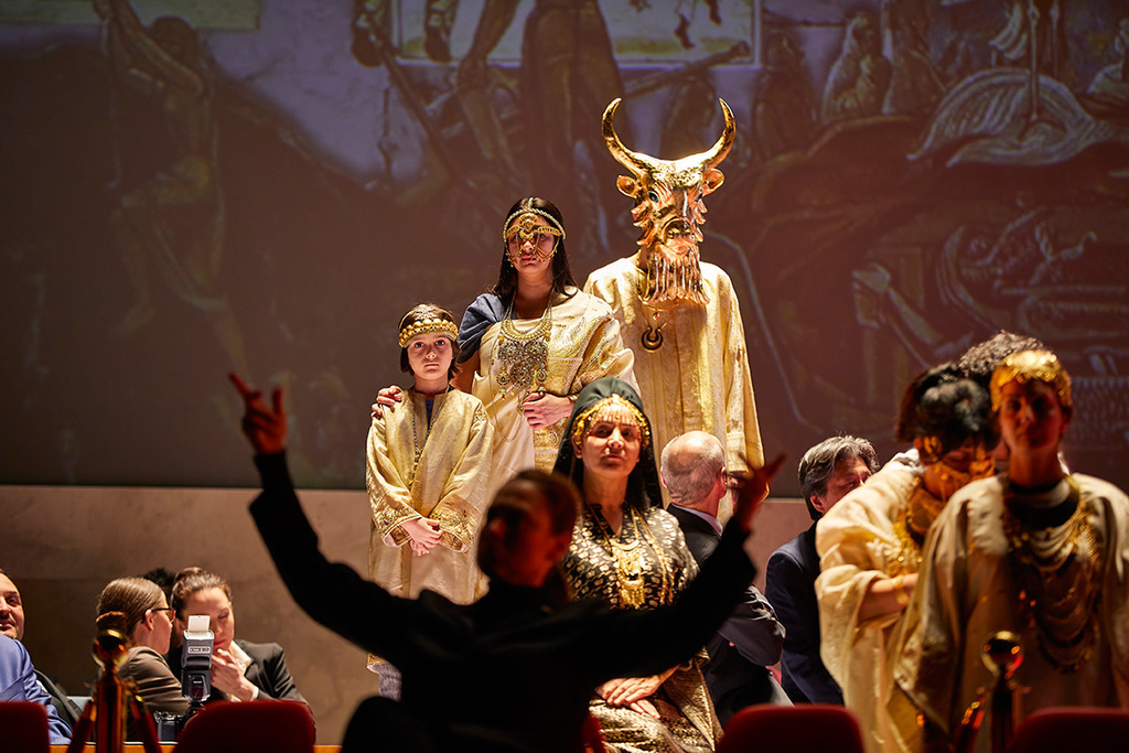Пока хор пел «Лети, златокрылая мысль» на фоне палаток, показывали фотографии детей в «золотых» пластиковых накидках от дождя. Такова сила метафорического мышления постановщиков. Потом этот хоровой номер исполнили и беженцы.
