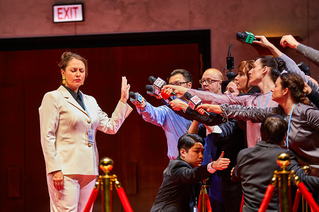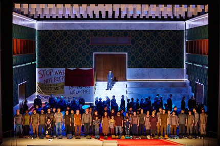 Если хватает сил смотреть практически постоянно идущий на сцене телевизор, то можно увидеть по нему среди прочего, как арестованную Фенену усаживают в машину. Всё заканчивается торжеством национальных костюмов, культурного многообразия и встречей прошлого и настоящего. Цель — напомнить о том, что США и Россия несут ответственность за войну в Сирии (Набукко — это Трамп и Путин в одном лице), а также о том, что беженцам нужно помогать.