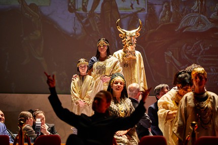 По опыту посещения подобных мозаичных спектаклей, перенасыщенных элементами, известно, что музыка в них не звучит. Так оно и оказалось. Дирижёр Паоло Кариньяни предложил камерную версию «Набукко», лишённую масштабности, мощи и энергии, так же слабо прочерченную музыкально, как и драматургически. Удались моменты более задушевные: мотив «Лети» в увертюре (в это время уборщицы наводили чистоту в Совете); мягко и проникновенно прозвучала ария Набукко (Димитрий Платаниас). Жеральдина Шове (Фенена) в своих серых костюмах совершенно потерялась, как будто её и не было. Довлету Нургельдиеву (Измаил) и Александру Виноградову (Захария) для раскрытия их потенциала и усиления их вокальных возможностей не хватало сценической поддержки: они как-то блёкли на общем интенсивном информационном фоне.