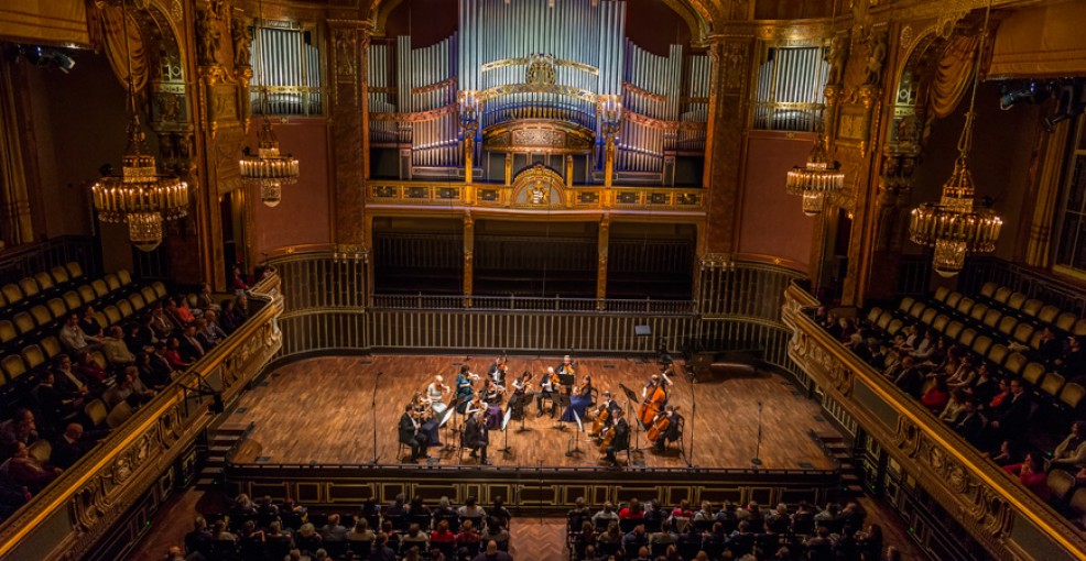 Внутри великолепие интерьеров сообщает чувствам фантазийную пластику ар-нуво. Зрение подготавливает слух. Остаётся слушать. За этим я отправилась 16 марта в Большой зал Академии, заранее предугадывая добрый вкус в лаконичной симметрии частей, составивших программу вечера. В двух отделениях фортепианные концерты Моцарта, четырнадцатый и пятнадцатый, дополняла подходящая им пара произведений – до мажорный струнный квинтет Михаэля Гайдна и моцартовская симфония номер двадцать три, K. 181. Оркестр обрамлял звучание рояля, поэтому справедливо прежде рассказать об этой искусной оправе.