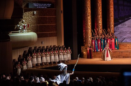 Масштабное зеркало сцены в оперном театре Владивостока — идеальное место для воплощения высокой трагедии. Режиссер сам стал автором и сценографии, и световой партитуры. Огромные колонны цвета состаренного золота, массивные и словно олицетворяющие власть, расположенные по обеим сторонам сцены, ряд ступеней и задник, на котором постоянно меняются видеопроекции. Это может быть культовая для культуры Египта фигура сфинкса и даже... кадры нацистского парада в сцене триумфа, когда возвращается победитель — Радамес (Мэргэн Санданов) с плененными эфиопами. Костюмы персонажей (художник по костюмам Варвара Евчук) выполнены в насыщенно-ярких тонах, характерных для ориентальной культуры, но в то же время они несколько нейтральны, что опять-таки расширяет временное пространство трагедии.