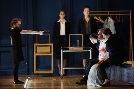 В постановке Кэти Митчелл персонажи любят и умирают в синей королевской спальне среди безмолвно снующих вокруг строго одетых придворных. Корону в стеклянной коробке привозят и увозят на специальной тележке. За всеми действиями взрослых постоянно наблюдают юные принц и принцесса (Оушен Баррингтон-Кук, роль без слов). Спектакль идёт полтора часа без перерыва и состоит из семи картин. Дети получают шесть уроков и в конце применяют полученные знания на практике: грубо поднимают из постели королеву и у неё на глазах готовятся самолично пристрелить Мортимера (в этот момент опускается занавес).