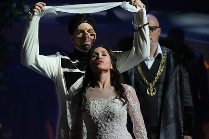 Если не ошибаюсь, это его первая премьера большой итальянской оперы в Одесском театре. И очень успешная! Меня порадовало звучание оркестра: унисон у струнных и последующее фугато в самом начале были сыграны с впечатляющей интонационной чистотой и подлинным brio. Баланс со сценой был идеальный, Чернецкий нигде не позволял оркестру «поддать звучка». Оркестровое вступление ко второй картине второго действия прозвучало чрезвычайно выразительно и с огромным напряжением. Медь звучала благородно, все кульминации — ярко и насыщенно, а пианиссимо, особенно у струнных — нежно и мягко. Соло первой скрипки в исполнении концертмейстера оркестра Оксаны Молдавановой были сыграны трепетно, волшебным звуком и с покоряющей чистотой.