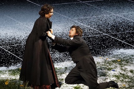 Именно в этом смысл и романа Пушкина, и лирических сцен Чайковского, поэтому снег, которого всегда ждешь в сцене дуэли, но который вдруг начинает идти в заключительной сцене в момент финального выяснения отношений Онегина и Татьяны, – не иначе как происки от лукавого. Именно они и приводят к названному эффекту «запаздывающего режиссерского потенциала». Но весьма показательно и то, что на аванзанавесе перед каждой сценой давались установочные текстовые ремарки места действия, и это, похоже, единственный способ для режиссера сказать об этом зрителю, если сделать это средствами театра он просто не может…