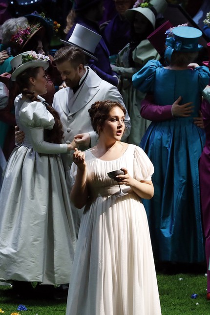 Помещичий уклад и быт русской деревни первой половины XIX века, то, к чему взывает и роман, и опера, вообще остаются за кадром, а вместо этого – разудалый режиссерский китч. От сюжета и музыки он уводит настолько далеко, что мы попадаем на «детский утренник» с забавными зверушками, к числу которых примыкают не только ряженые, но и конкретные герои, будь то Ларина или Филиппьевна, Татьяна или Ольга, Онегин или Ленский. Речи о типажах-архетипах быть не может, ибо их проработки нет и в помине ни на режиссерском, ни на костюмном уровне. Представлен лишь «общий зоопарк» образов, случайно набросанных на зеленую лужайку сцены для игры в оперные бирюльки. Режиссер изо всех сил пытается играть в эту игру, но не больно-то у него это получается!