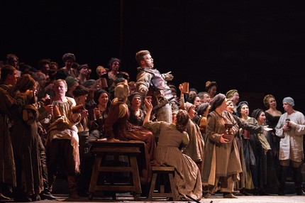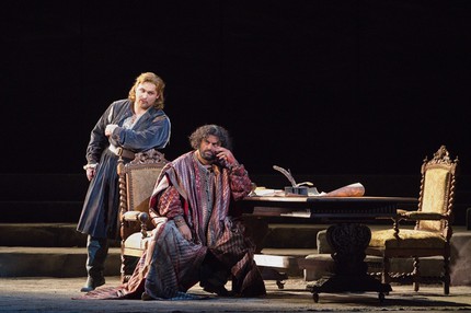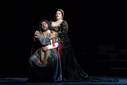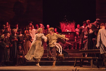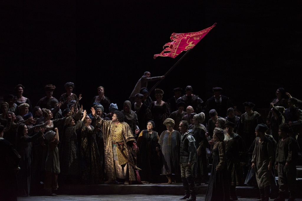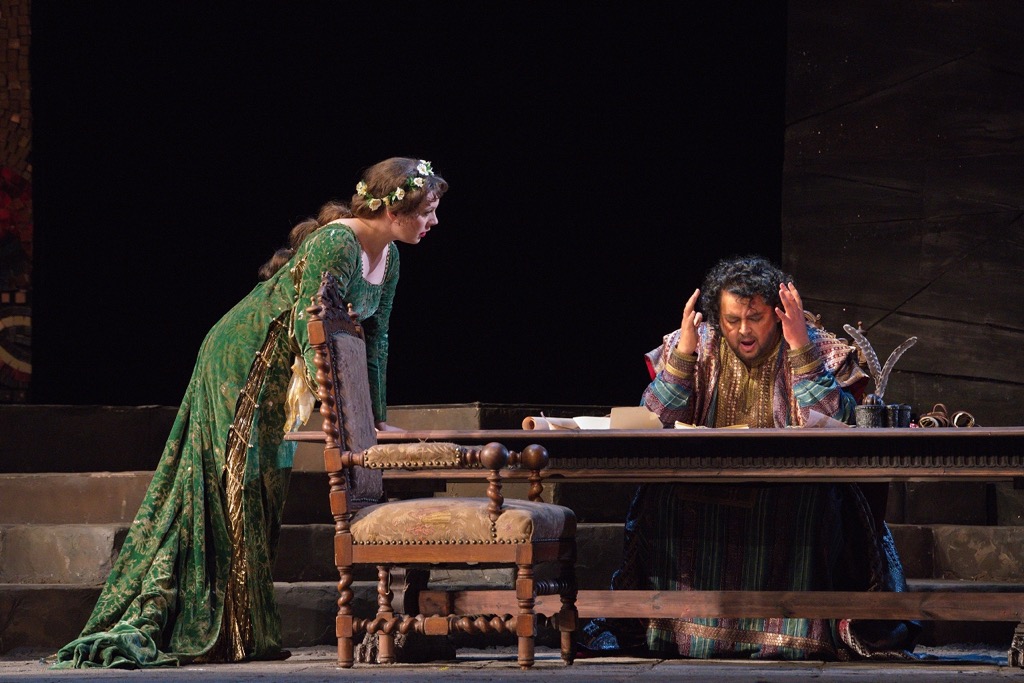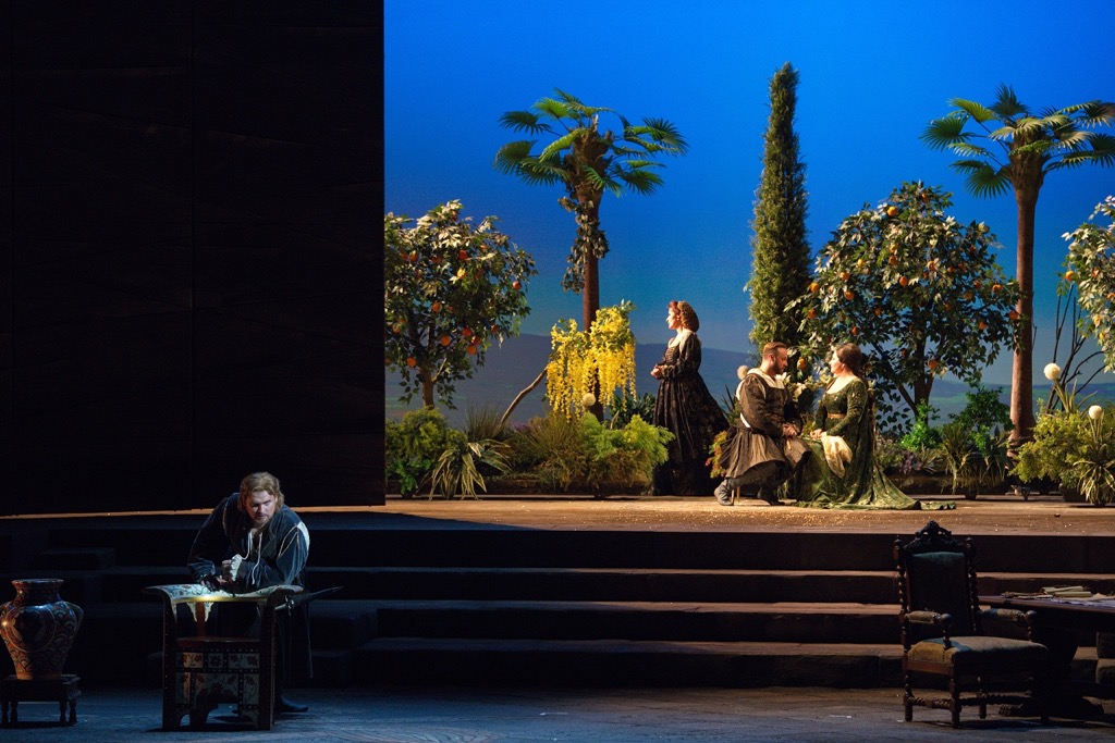 На этот же результат прекрасно поработали художник-постановщик Мэтт Дили и художник по свету Айвар Салихов. Золотистая византийская мозаика, кипрский пейзаж с ослепительно-голубым небом и райскими деревьями, церемонно шествующие дамы в костюмах Возрождения... В опере не принято аплодировать открывшейся картине, но здесь это очень хотелось сделать, словно после удавшегося вокального соло.