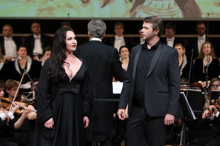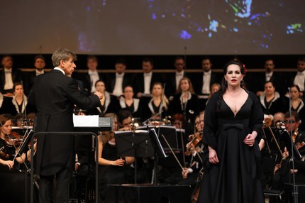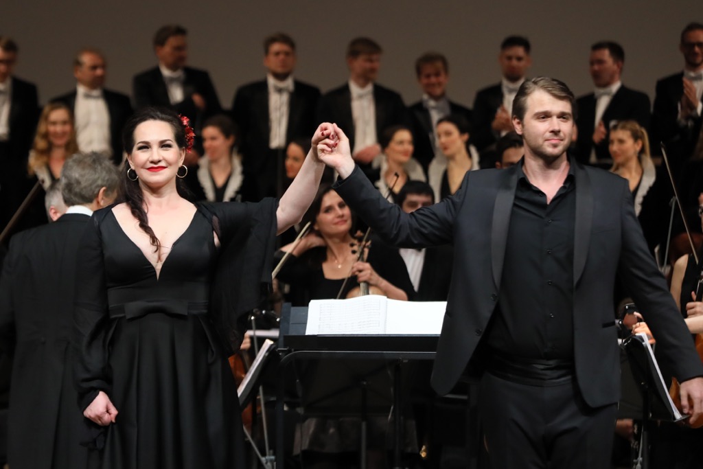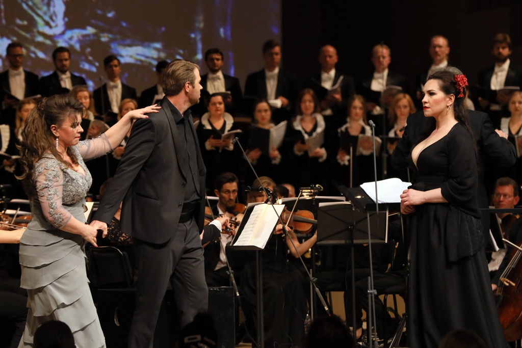 На авансцене перед оркестром и хором певцы-солисты не просто исполняли свои партии, но и в весьма условной манере пытались разыгрывать подобие мизансцен, что в статику концертного формата добавляло призрачной «театральности». Опера в четырех актах была поделена пополам, и в первой части явно бросающихся в глаза купюр как будто и не было. Но в начале второй части – после прелюдии к третьему акту – ни знаменитого хора контабандистов, ни сцены на привале, где происходит стычка Хозе и Эскамильо, мы так и не услышали. А ведь по логике развития сюжета, неотступно ведущего к роковому для Кармен финалу, она драматургически важна, и ее купирование весьма сомнительно.