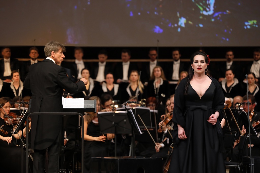 А в Музее современной истории России в Москве вслед за названным концертным исполнением «Кармен» 10 июня открылась выставка «Елена Образцова. Голос и судьба», также посвященная юбилею певицы, и в рамках ее открытия состоялся камерный вокальный концерт, в котором выступили молодые исполнители, так или иначе попавшие в орбиту деятельности Фонда. В юбилейном исполнении оперного шедевра Бизе «Кармен» были задействованы оркестр и хор Московского театра «Новая опера» им. Е.В. Колобова. Музыкальным медиумом проекта стал главный приглашенный дирижер и председатель художественно-творческой коллегии этого театра Ян Латам-Кёниг. В концерте также принял участие хор «Пионерия» детской музыкально-хоровой школы им. Г.А. Струве. Зрителя и слушателя в атмосферу этнической сюжетной испанскости дополнительно погружал слайд-проекционный визуальный ряд на большом экране (эскизы декораций Александра Головина к постановке «Кармен» 1908 года). При этом супратитры на русском помогали не расплескать тонкостей сюжетных взаимоотношений героев, ибо пели они, как давно уже принято в современной традиции, на языке оригинала – французском.