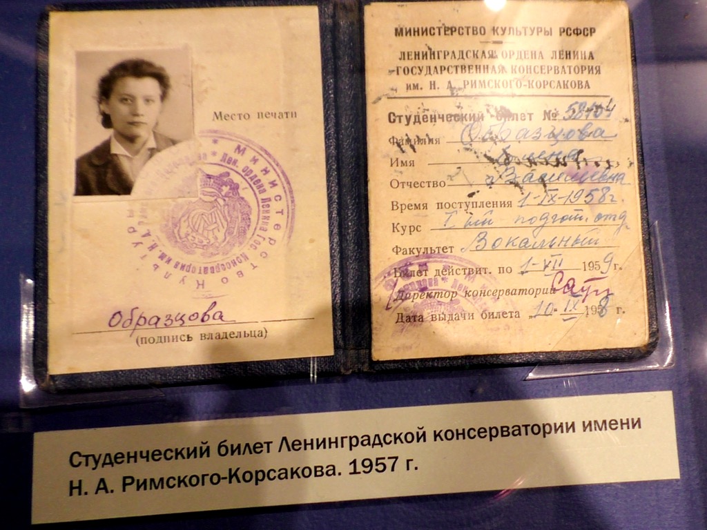 Послевоенный Ленинград возрождался, а с ним росла и взрослела Елена, и уже тогда её влекла музыка. В одной из витрин выставки можно видеть программку отчетного концерта детского хора Ленинградского дворца пионеров под руководством легендарной Марии Заринской, где написано: «Солистка – Лена Образцова» и черно-белую фотокарточку солистки Лены с Марией Федоровной. В этой же витрине — школьный ученический билет и фотография у моря в «Артеке» — задумчивая Лена облокотилась на огромный камень. Странно, что Елена Васильевна в своих многочисленных интервью не рассказывала о том, что её наградили путёвкой в «Артек», который в советские годы был пределом мечтаний для всех школьников Советского Союза – в него попадали только самые талантливые дети с большим списком достижений в учебе, творчестве или спорте. Это был не просто лагерь, а особая, прекрасно организованная детская страна со своим необыкновенным укладом жизни.