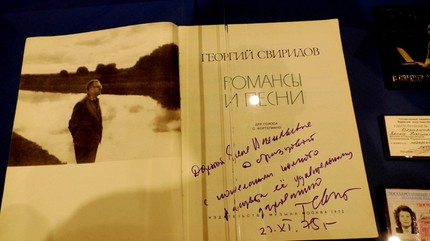 В романс Свиридова «Роняет лес багряный свой убор» из репертуара Елены Образцовой, запись которого тоже можно было услышать на выставке, не вошли строки Пушкина из стихотворения «19 октября»: