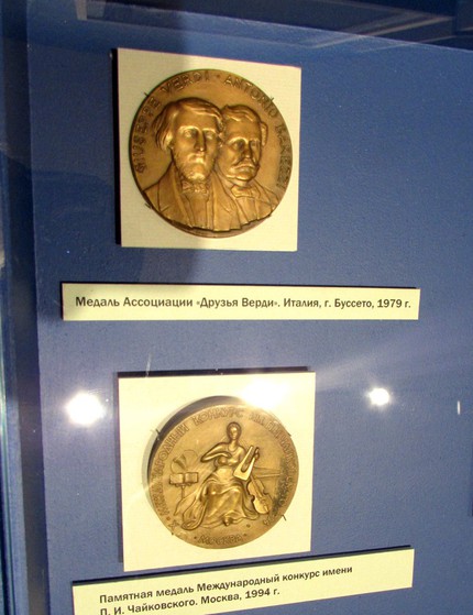 А в «Кармен», одной из её коронных партий, Кармен поёт: «Мелькают краски, маски, лица», - это ли не о жизни самой Образцовой? А это тоже Кармен, но о том, как Елена живёт в спектакле: «Из нитей огненных страстей плетёт узорчатые ритмы». Данкайро и Ромендадо будто в воду смотрят, говоря о Кармен (читай – Образцовой, как лучшей Кармен мира – она действительно получила такое звание-признание): «Любые роли вам под стать. … актрисы высший класс, без лишних фраз и без гримас. … Ей по праву «бис!» и «браво!», ей игра сулит успех». А свидетельств этого всемирного успеха в экспозиции много: и награды, и афиши Ла Скала и других знаменитых театров мира, подарки поклонников и официальных лиц государств, удостоверения о присуждении званий Народной артистки СССР и Героя социалистического труда – высшие звания, которых человек мог удостоиться в Советском Союзе.