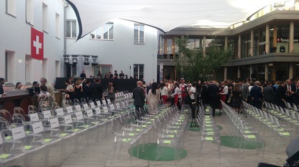 Швейцарские отпрыски посольской яблони – «Московской Розы Берна» – важные символы культурных, социальных, экономических и политических связей между двумя странами, и зеленые круги-«лужайки», рассредоточенные по площади внутреннего двора Посольства Швейцарии в Москве в соответствии с локализацией столиц кантонов на карте Конфедерации, о проекте «Двойное местоположение» призваны напоминать посетителям и гостям постоянно. Начало прибытия и сбора гостей стало стартом для начала мероприятий основной программы, и все они прошли в режиме open-air на «мини-карте Швейцарии», но в этом-то и был весь шик! Над внутренним двором Посольства был натянут огромный белый тент, так что если бы даже пошел дождь, проведению праздника он бы не помешал.