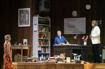 Руководитель Нюрнбергского государственного театра, в котором по традиции одновременно и поют, и танцуют и разговаривают, Йенс-Даниэль Херцог поставил патриотический опус Вагнера хоть и с «концепцией» (театр в театре), и даже с протестом (режиссёр любит протест), но всё-таки довольно осторожно: в декорациях и костюмах, приятных глазу. Получилось масштабно, статично, местами красочно и визуально в рамках допустимого. Прямая политическая подоплёка в представлении практически отсутствовала, а вот в исполнении именно политический акцент, без которого «Мейстерзингеры» не мыслимы, прозвучал, как гром среди ясного неба. Но об этом чуть позже.