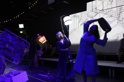 На тёмном полу был нарисован план квартиры, по нему ходили и танцевали в строительных комбинезонах и в домашних халатах.
