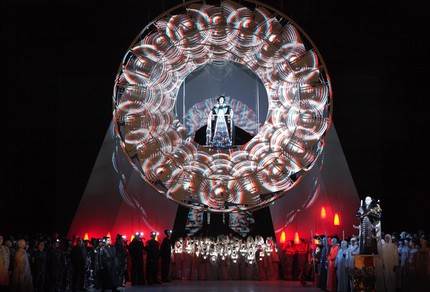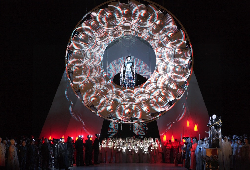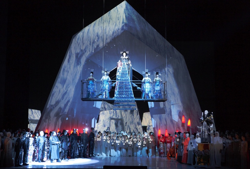 Известный как автор эффектных шоу Карлуш Падрисса со своей командой «Ла фура дельс Баус» использовал в своей версии «Турандот» Пуччини акробатов и 3D видеоинсталляции; всем зрителям раздавали 3D очки, которые нужно было надевать в специально отведённых для видеонаслаждения местах представления. Это было завораживающе и в духе восточной сказки без конца, о котором позже. Что было совсем ни в какие ворота, так это полная культурологическая каша в голове постановщика: кроме логичной «китайщины», на сцене присутствовал не только «жапонизм» (от фр. Japonisme) — танец с веерами, но и совсем уж неуместная тут «идушатина» доведийского шиваизма (многорукая Шива-Турандот).