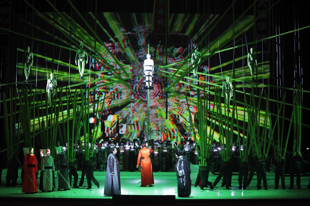 Что для меня в этом спектакле стало ценным и важным, — так это отсутствие какого бы то ни было не-пуччиниевского конца: опера обрывается на сцене вознесения в 3D-лучах пронзённого бамбуком и «распятого-в-зелени» тела Лю, перед которым, не прикасаясь друг к другу, застывают любитель загадок и принцесса-недотрога.