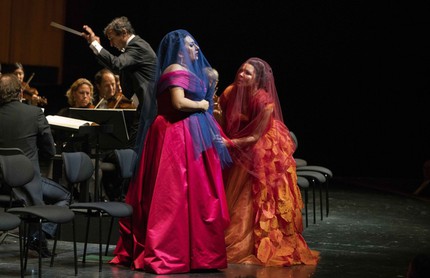 Это как раз тот случай, когда мозг отключается, и на редкие неровности внимания почти не обращаешь, хотя выходная ария Адрианы «Io son l’umile ancella» была исполнена с такой грацией, с такими тягучими лучезарными пиано и воодушевлением, что Большой фестивальный зал устроил певице оглушительную, почти двухминутную овацию. Не менее чудесно прозвучала певица в дуэтах, сценах, скандалах и драматических разборках. Всё зашкаливало, полыхало, бурлило, клокотало.