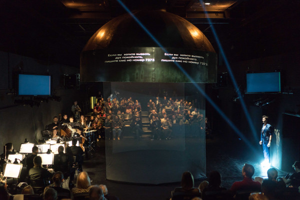 Для публики в зале «Храм надежды» – сценографическое пространство под большим «медным колпаком» в форме перевернутого котла. С двух сторон оно огорожено ширмами суперзанавесов, через которые за всем происходящим в нём публика наблюдает с двух сторон вытянутого зала (артистам же приходится играть и петь на две стороны). Теперь при специальной двусторонней рассадке «сцена» оказывается в центре: через один «портал» между суперзанавесами оркестр с дирижером «наполняют» ее пространство музыкой, а через другой в нём появляются (и из него «исчезают») артисты.