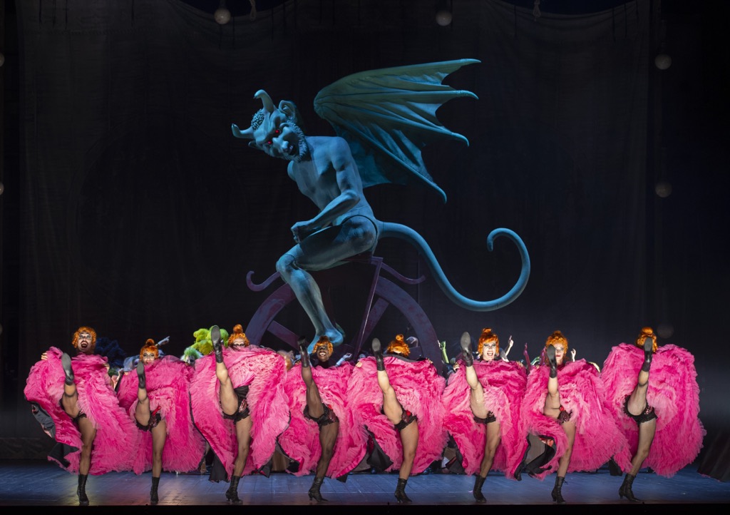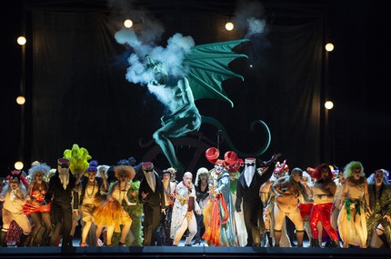 Зальцбургский «Орфей в аду» тоже окрашен в тона берлинского кабаре, с его провокационностью и мрачноватой атмосферой, пропитанной сексом и физиологическим юмором. Художник-постановщик Руфус Дидвисус с бешеной скоростью прокручивает сценографический калейдоскоп: камерная атмосфера оффенбаховского театра-бонбоньерки сменяется стильным Олимпом в духе Belle Époque и феерическим Адом, где огромный зеленый черт на огненном колесе пускает фейерверки изо всех мест. Отто Пихлер запускает хореографическую пиротехнику: балет сексуальных пчелок, адские танцоры с отрубленными головами в руках и канкан со шпагатами. Костюмы Виктории Бер в карнавальном безумии сочетают все элементы всех мыслимых эпох.