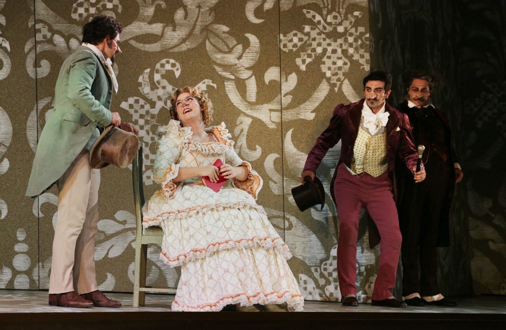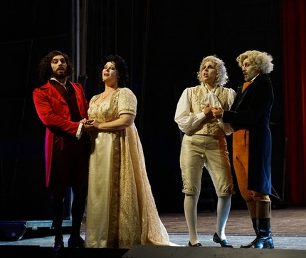 При этом, как ни странно, костюмно-сценографический антураж вкупе с мизансценами был созвучен атмосфере… гоголевской «Женитьбы»! Поверить в это трудно, но это так! На сей раз женихов – двое, а «сват»-устроитель – Фронтино! В аспекте вокала итальянцы Мануэль Амати (Фронтино) и Клаудиа Мускио (Розалия) лишь вполне зачетны – не более. Однако герои-буффо (тоже итальянцы) поистине неотразимы! Гамберотто – прирожденный маститый лицедей Паоло Бордонья, один из неоспоримых кумиров Пезаро. Бураликкьо – Давиде Лучано, и его здешний послужной список также внушителен! А итальянка Тереза Иерволино (Эрнестина) с истинной примадонной не ассоциируется вовсе. В единственной партии в Пезаро (Лючия в «Сороке-воровке» в 2015 году) она была на своем месте, но для выпевания фиоритур Эрнестины ей явно не хватило ни подвижности голоса, ни диапазона, ни филировки. Зато дебютант фестиваля, наш соотечественник Павел Колгатин, в партию Эрманно вписался идеально! Его изумительной красоты лирический тенор просто нашел свою партию, покорив и чувством, и техникой, и высочайшей певческой культурой!