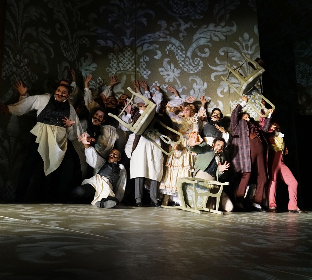 Здесь мы как раз и подходим перипетиям сюжета, однако для знакомства с ними дадим отсылку к собственной справочной публикации. Скажем лишь, что если прошлая постановка, даже при всей ее «высосанности из пальца», традиционной терпкости итальянской буффонады не отменяла, то нынешняя, хотя и изобилует яркими – на редкость удачными и стильными – гэгами, явной буффонады не обнаруживает. Все персонажи носят маски с утрированно большими носами, и это отчасти сближает действо с традиционной итальянской комедией dell’arte, эффект которой – вовсе не в актерской буффонаде, а в расшифровке сознанием базисных характеров-символов и формул их поведения. Всё очень весело и на сей раз, но без гипертрофированности эмоций. Всё очень легко и динамично, но без отягощения бытовым антуражем. Всё очень стильно, и всё в духе сюжета и музыки!