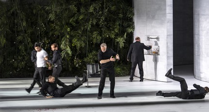 Народ, выборы, претенденты, оппоненты, главный герой сначала не хотел, потом захотел, потому что Мария, которая умерла, а до этого которая родила ту, которую не уберегла та, которая умерла и которая передала всё той, которая прожила под чужим именем у того, который ничего не знал, но был дедушкой, и которая была невестой, но стала дочкой, а потом ещё и внучкой, а потом вообще вышла замуж за того, кто хотел убить её отца, и осиротела, и это ещё без подробностей. В общем, для любителей Верди — ничего нового: ни в музыке, ни в словах. Что с этим всем сделал режиссёр Андреас Кригенбург?