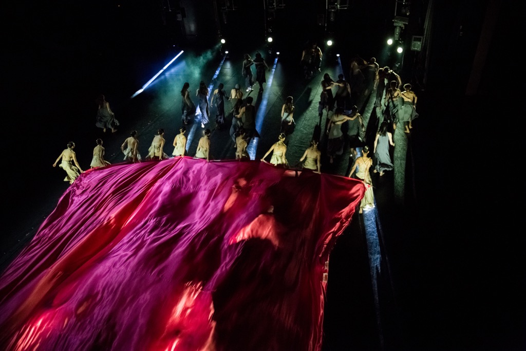 Композиционная многоплановость воплощается и в эффектном обобщённо-символическом финале. Алое, как кровь, полотно, резко опускающееся с колосников во время оглашения желания Саломеи, становится своеобразным кровавым морем, по которому перекатываются все участники кордебалета (ибо они все — непосредственные участники разыгравшейся трагедии), и которое лихорадочно пытается собрать в единый ворох Ирод («Нет, с рук моих весь океан. Не смоет кровь»). И этот алый лоскут ткани преобразуется в кровавое ложе титульной героини. А все участники кордебалета, словно песчинки в перевёрнутых песочных часах, один за другим падают в оркестровую яму. Зыбучий песок времени поглощает всех и всё. Падая, пылинки праха с сотнями песчинками в вечном потоке времени утрамбовываются в каменный склеп памяти, даря вечность, но не забвение.