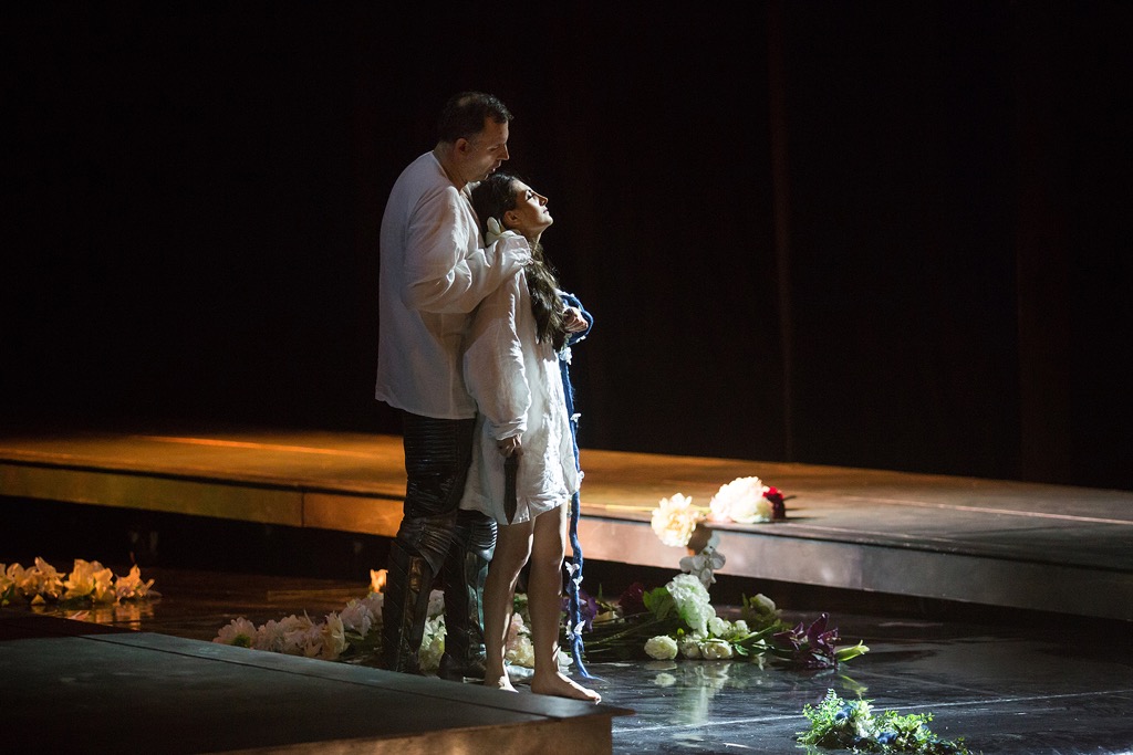 Предание о бесславном конце царского Рима – предание о временах темных, и темнота, из которой высвечиваются зримые образы героев и «хора», – лучшая, практически идеальная сценография со светопроекционным фоном задника, зримо эволюционирующим по ходу развития «симфонии сюжета». Но это мы и наблюдаем в спектакле! А что касается абстракции сценографического пространства, то в прологе и первой картине плита-подиум, чуть нависающая над оркестром, – словно «ассоциация в лоб» с взаимопроникновением театра и музыки. Эта плита – исток реки трех финальных картин спектакля; исток реки, которая в центральной картине с участием Лукреции вероломно оскверняется Тарквинием; исток реки, в которую не только нельзя войти дважды, но из которой нельзя вообще выйти, если запятнан в грехе порока… А это ведь де-факто и происходит!