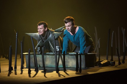 В трех финальных картинах спектакля русло воображаемой реки обозначается двумя половинами разъезжающейся к кулисам плиты-подиума (того, что было в первой картине). Жесткая статика сцены в этих картинах вполне укладывается в развитие «театральной симфонии», в которой лишь действенно меняются, словно призрачные абрисы силуэтов в тумане, сами герои этой необычайно хрупкой и страшной оперы Бриттена, слушая которую боишься проронить малейший штрих, малейшее «дуновение». И в этом заслуга не только ансамбля солистов-певцов, «сольного хора» и оркестра, но и, конечно же, маэстро Яна Латама-Кёнига за дирижерским пультом и по совместительству за фортепиано. В музыку Бриттена он влюбился еще в бытность дискантом в хоре мальчиков, когда многократно участвовал в исполнениях «Военного реквиема» Бриттена под управлением самогó автора!