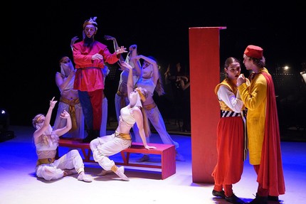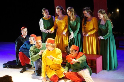 Однако заведомо скупую в аспекте зрелищности и, по всей видимости, намеренно культивируемую постановщиками студийность, которая как раз и дает актерам широкий простор для их множественного перевоплощения, художник Мария Медведева разумно дополняет пестроцветно «веселой» классикой средневекового костюма. Психологической сюжетной яркости это добавляет яркости внешнего колористического настроя. Но ведь чрезвычайно важна и пластическая составляющая актерского действа, и, беря этот аспект в свои руки, балетмейстер Ирина Новик динамично живым мизансценам режиссера придает финальный лоск пластической отделки. В результате бравый «триумвират» режиссера, художника и балетмейстера уверенно правит театральный бал с поразительной творческой слаженностью, просто с какой-то сверхпрофессиональной эффективностью и отдачей!
