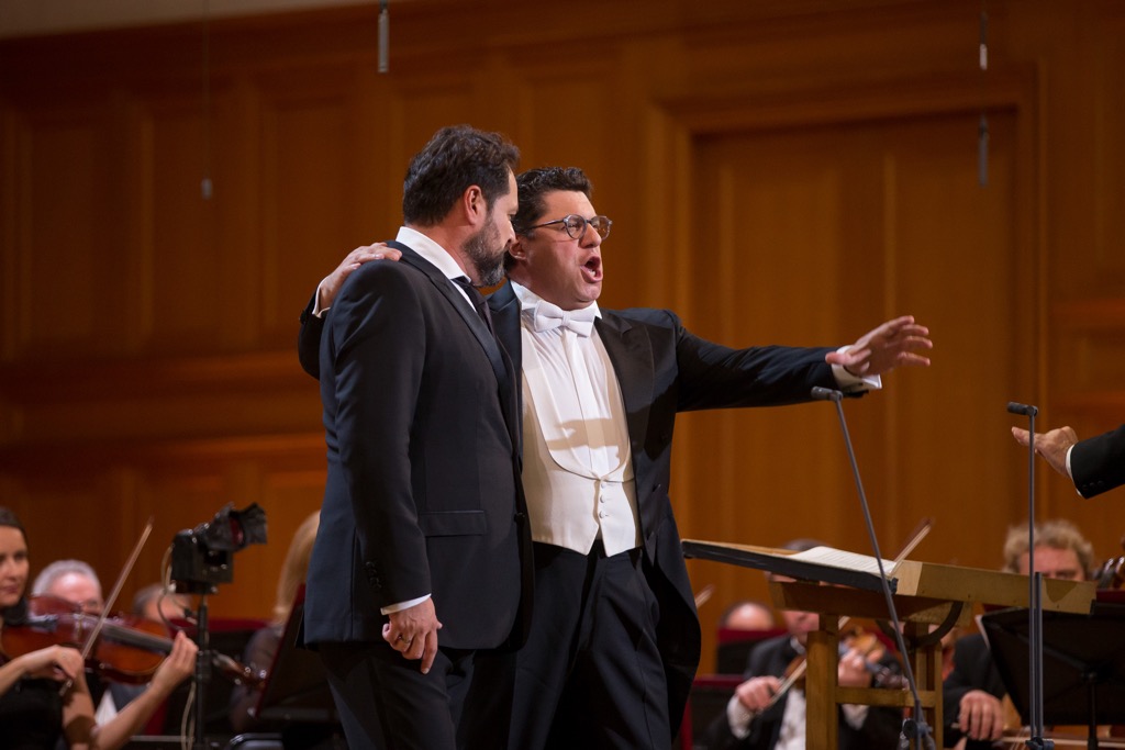 Буквально «перепев» Луку Сальси в дуэте Аттилы и Аэция (Эцио) из «Аттилы» Верди, настоящее итальянское бельканто раннего периода творчества композитора явил Ильдар Абдразаков. Не так давно в прошлом сезоне эту оперу он поставил в Уфе, спев в ней главную партию, а на концерте два политических противника Аттила и Аэций вступили в музыкальное противоборство вновь. Однако Италию наш русский бас Аттила итальянскому баритону Аэцию, как тот просит Аттилу в этом дуэте, не только не отдал, но даже не сдал и пяди завоеваний вокальной школы отечественных басов! По значимости этот большой развернутый дуэт, пожалуй, стал центральным номером всей программы. Думать так заставила и пресловутая доминировавшая в зале широкая публика, услышавшая эту музыку впервые в жизни и два раза пытавшаяся прервать исполнение аплодисментами в отчетливых паузах, искренне думая, что это уже финал…