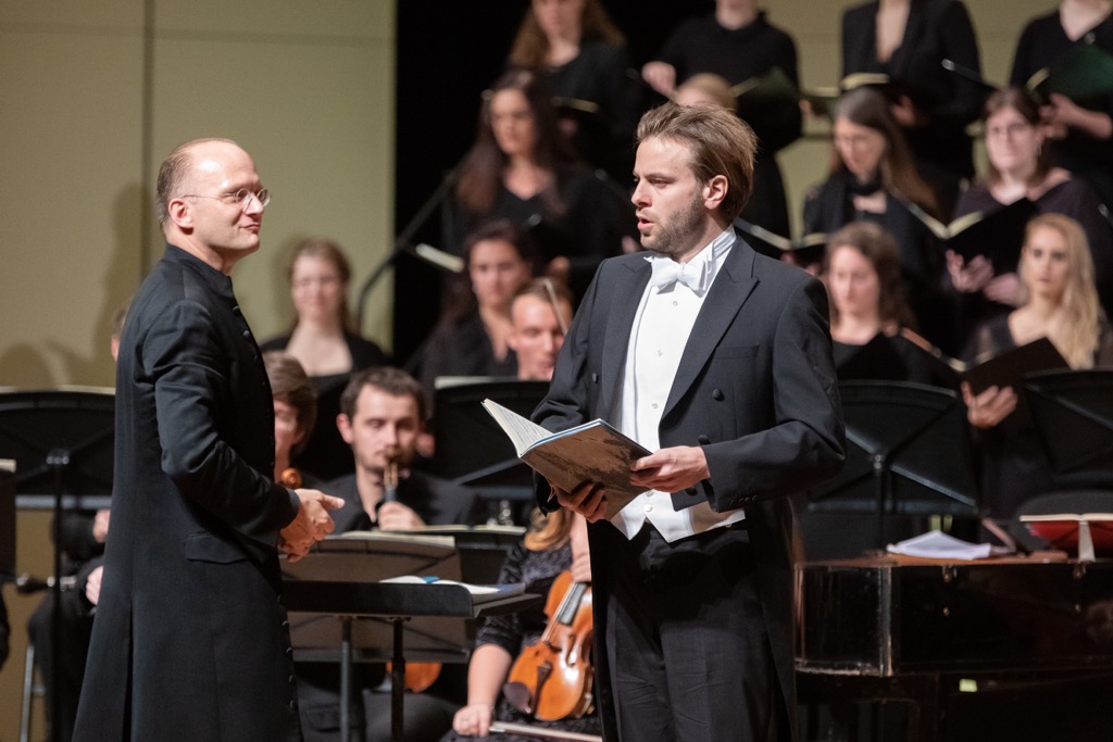 В «Магнификате» Бах-отец использует пятиголосный хор, что весьма необычно, а Бах-сын – четырехголосный. В первом случае предполагаются пять голосов солистов (два сопрано, альт, тенор и бас), а во втором – четыре (сопрано здесь одно). Но в обоих случаях в этот раз на концерте было всего четыре сольных голоса: сопрано – Каталина Бертуччи (Чили – Италия), альт (меццо-сопрано) – Юлия Бёме (Германия), тенор – Михаэль Фейфар (Швейцария), бас-баритон – Маттиас Винклер (Германия). Так что в «Магнификате» Баха-отца десятая часть «Suscepit Israel» (трио для двух сопрано и альта) на сей раз прозвучала в «хоровой транскрипции» женских голосов. В своих «Магнификатах» отец и сын прибегли к абсолютно характéрному для той эпохи составу оркестра, хотя от первой до финальной редакции он и менялся. И если Бах-отец решал музыкальные задачи всё же в ренессансно-барочной эстетике, то Бах-сын при заведомо генеральной преемственности стиля своего отца – в барочно-классицистском преломлении, словно подготавливавшем почву для этого жанра в творчестве Гайдна и Моцарта. С Камерным оркестром России партию органа в необычайно этом увлекательном московском проекте исполнил Александр Фисейский.