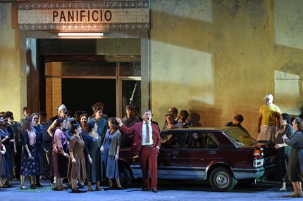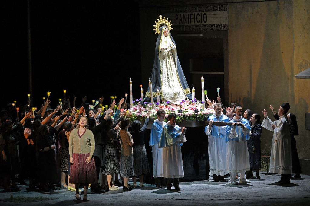 А на уровне визуального зрительского восприятия оба оперных сюжета, весьма удачно и поразительно корректно перенесенные из XIX века в послевоенные 50-е годы XX века, но оставленные на исконной итальянской почве, предстали, словно двумя сторонами одной оперной медали веризма. В этом режиссеру весьма искусно и профессионально помогли его постоянные коллеги – сценограф Паоло Фантин, художник по костюмам Карла Тети и художник по свету Алессандро Карлетти, а перенос постановки на сцену театра «Лисеу» добросовестно осуществила Элеонора Граваньола. Сценография каждой оперы диптиха идет по пути единой конструкции-коробки, вращающейся на поворотном круге и всё время открывающей либо обновляющей те или иные сюжетные локализации. В каждой опере эта конструкция – своя, оригинальная, но ее «дизайн» не оставляет ни малейшего сомнения в том, что события обеих опер последовательно, хотя, возможно, и с неким сдвигом во времени, локализованы в пределах одного и того же селения итальянского Юга.