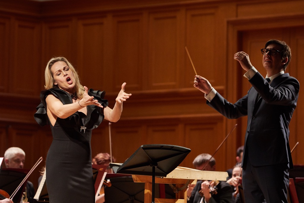 Вокального драматического запала Джонатану Тетельману недоставало и в финальном дуэте из «Андре Шенье». Партия поэта-революционера притом, что владение спецификой стиля этой музыки никто не отменял, предполагает особую вокальную «ядреность», особую пряность музыкального посыла, но именно этого фактура звучания певца дать просто не может, и это всё та же проблема, что присуща и звучанию Кристине Ополайс – проблема неадекватности вокальных возможностей исполняемому репертуару. Но если для певицы неадекватность музыкальным задачам Пуччини абсолютно очевидна, то Джонатана Тетельмана и в двух прозвучавших дуэтах Пуччини (из «Манон Леско» и «Богемы»), и в предсмертной арии Каварадосси из третьего акта «Тоски» проблемы стилистической неадекватности, в целом, миновали. И если в музыке Верди певцу недостает изысканности и утонченности, то «аристократический» музыкальный драматизм Пуччини ложится на его голос с постижением глубинного внутреннего драйва самóй этой музыки. Форма дуэта в концертном формате не столь эффектна, как ария, но арий певец спел всего две. И всё же прозвучавшая романтическая ария художника Марио Каварадосси убеждает в том, что, в отличие от нашей героини-сопрано, с музыкой Пуччини тенор дружит очень «правильно»!