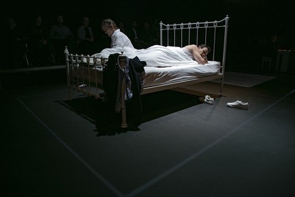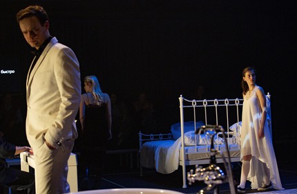Декорации Ксении Перетрухиной минималистичны и точны. Два цвета – черный и белый, как в старом кино. Три кровати, три ванны, три фортепиано – редупликация простых структур, комната-метаморф, которая меняется, но остается той же самой. Лиз (Мария Деева), Поль (Андрей Юрковский), Агата (Мария Юрковская) и Жерар (Максим Дорофеев) переходят из дома на улицу, в модный салон, в особняк жениха Лиз – но при этом никогда не покидают замкнутого мира детской.
