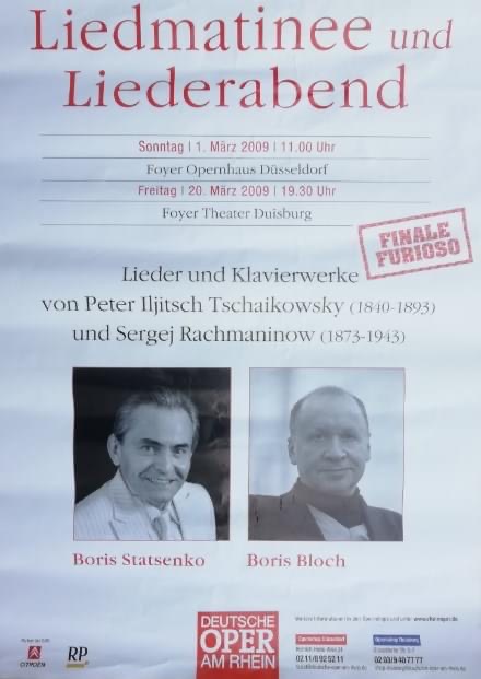 Надо сказать, что на наших концертах был весь «Дюссельдорфский Петербург» или «Петербургский Дюссельдорф», не знаю, как лучше обозначить нашу публику, и впервые на таких концертах в «Deutsche Oper am Rhein» зал был переполнен и над кассой, наконец, мог водрузиться немецкий Аnschlag, сообщающий публике, что все билеты проданы. Как поёт Франческа да Римини в одноимeнной опере Рахманинова: «В тот день мы больше не читали», т.е. больше нас туда не приглашали. (Зависть — очень нехорошее чувство.)