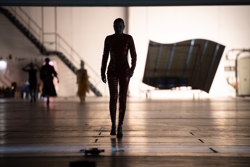 В этом спектакле больше всего раздражает практически полное отсутствие живого контакта с исполнителями. Сцену «продлили» до предела, она превратилась в освещённый по сторонам снизу широкий туннель, по которому навстречу зрителями долго выходят артисты. Сверху находится экран для демонстрации параллельно снимаемых на камеру лиц, мультфильмов и отрывков из фильма Квентина Тарантино «Бешеные псы». Освещение слепит глаза, а от экранов уже, казалось бы, все устали за время карантина. Какой смысл покупать билет в наконец-то открывшийся театр для просмотра «Бешеных псов»? Непонятно, зачем на сцене дублировать такие реалии коронавирусного кризиса как дистанция и опосредованность — они и так на виду.