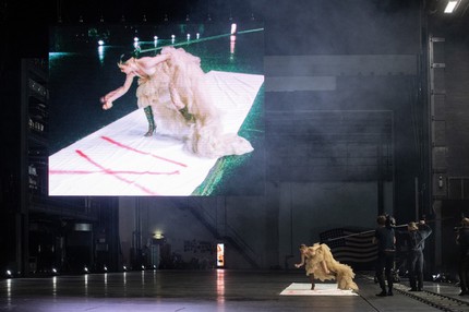 Спектакль открывается «Прибытием царицы Савской» из оратории Генделя «Соломон». В это время рыжая кудрявая девушка танцует с американским флагом.