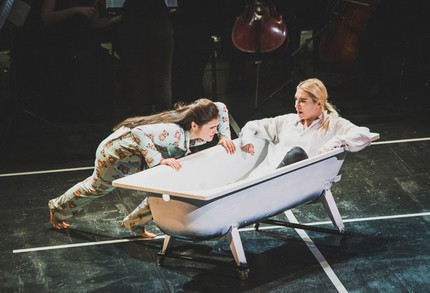 Применительно к сценографии речи о каком-либо «историзме» не идет вовсе, ибо в постановке, вставшей на рельсы студийности, сценографии в привычном понимании нет. Однако ее центральный атрибут – белая эмалированная ванна на колесиках, которую то и дело выкатывают на сцену и укатывают за кулисы, – и есть тот самый студийный «рояль в кустах», на котором всё и держится. С этой ванной связана цепь режиссерских ходов, апеллирующих к «загадочной» пластике миманса и статистов, а также к «загадочным» бытовым артефактам, возникающим по ходу дела и создающим абсолютно абстрактные, похоже, намеренно отстраненные визуальные ассоциации, «глубину» которых доподлинно постичь рецензенту, признаться, мудрено, но вполне можно трактовать и так и этак.